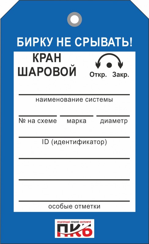 Информационная бирка "Кран шаровой" односторонняя. Изготовлена из пластика ПВХ, толщиной 0,3 мм, без ламинации, оснащена металлическим люверсом . По желанию заказчика толщина бирки может быть увеличена до 1-2 мм. Нанесение текста необходимо производить маркером или шариковой ручкой. Размер 70 х 115 х 0,3 мм.