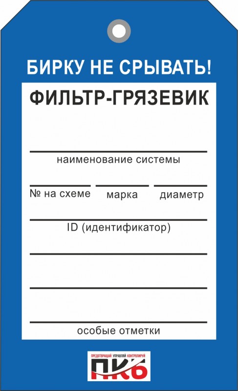 Информационная бирка "Фильтр-грязевик". Изготовлена из пластика ПВХ, толщиной 0,3 мм, без ламинации, диаметр отверстия 7 мм. По желанию заказчика толщина бирки может быть увеличена до 1-2 мм. Нанесение текста необходимо производить маркером или шариковой ручкой. Размер 70 х 115 х 0,3 мм.
